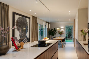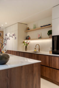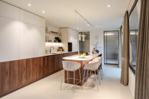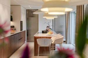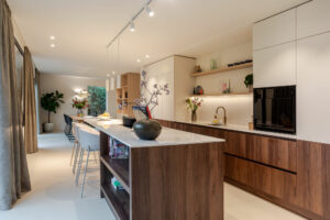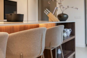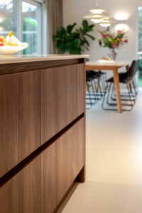 Vanaf het eerste gesprek met adviseur Ankie voelde het goed. “We hadden een beetje dezelfde humor. Het voelde niet als een klant-leverancier gesprek, maar gewoon gezellig.” De keuzes in kleur en opstelling waren vernieuwend. “De onder- en bovenkasten sluiten op elkaar aan, maar hebben een andere kleur. Ankie zag dat al op beurzen terugkomen en het past gewoon goed in ons huis.”