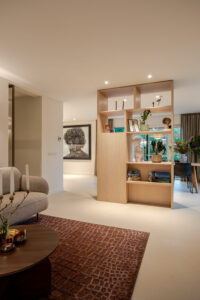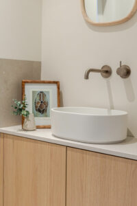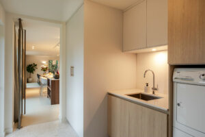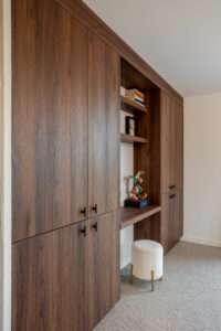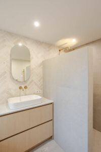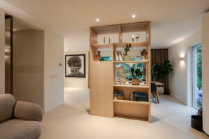 Niet alleen de keuken werd aangepakt. “We hebben ook kasten op de slaapkamers, badkamers en wc laten maken. En de bijkeuken, met dezelfde houtstructuur als de rest. Daar zijn we ook echt superblij mee.” De afwerking en stijl zijn overal doorgetrokken. Kim omschrijft die als een mix van Japandi en Scandinavisch. “Rustig, natuurlijk, en dat past perfect bij ons.”