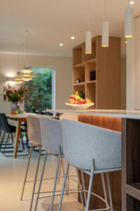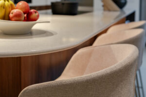 Aan de bar met overhang wordt vaak gezeten. Die keuze vroeg om een steviger blad dan ze oorspronkelijk wilden. “Het natuursteen dat we eerst op het oog hadden, was te kwetsbaar voor wat we ermee wilden. Dus we zijn op Ankie’s advies voor iets anders gegaan. Daar ben ik nu alleen maar blij mee.”