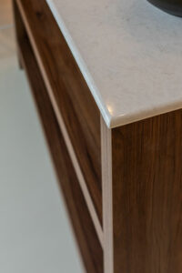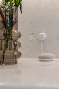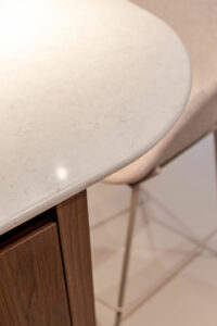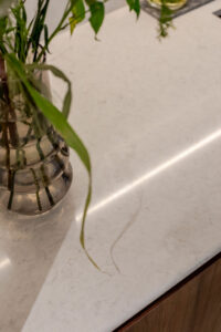 Kim is vooral blij met het werkblad, dat afgerond is en daardoor heel zacht oogt. “Dat ziet er gewoon zo smooth uit, dat vind ik zó mooi geworden.” Uiteindelijk kozen ze voor de Snowy Ibiza, een blad dat inmiddels op meerdere plekken in huis terugkomt: in de badkamer, het toilet en binnenkort ook op het tv-meubel.