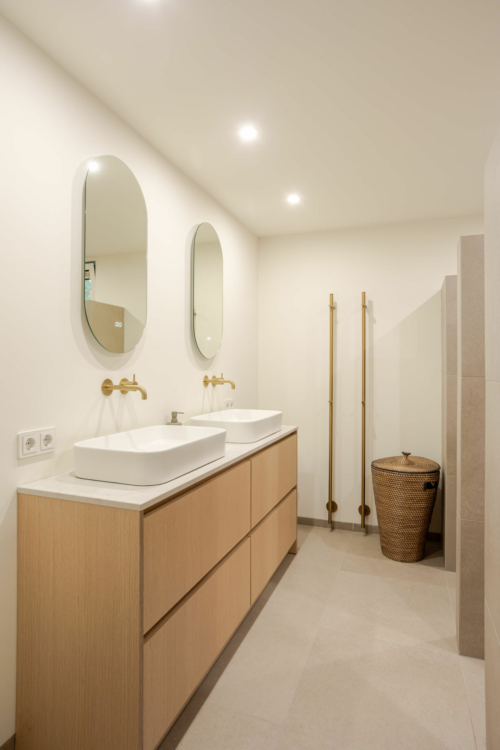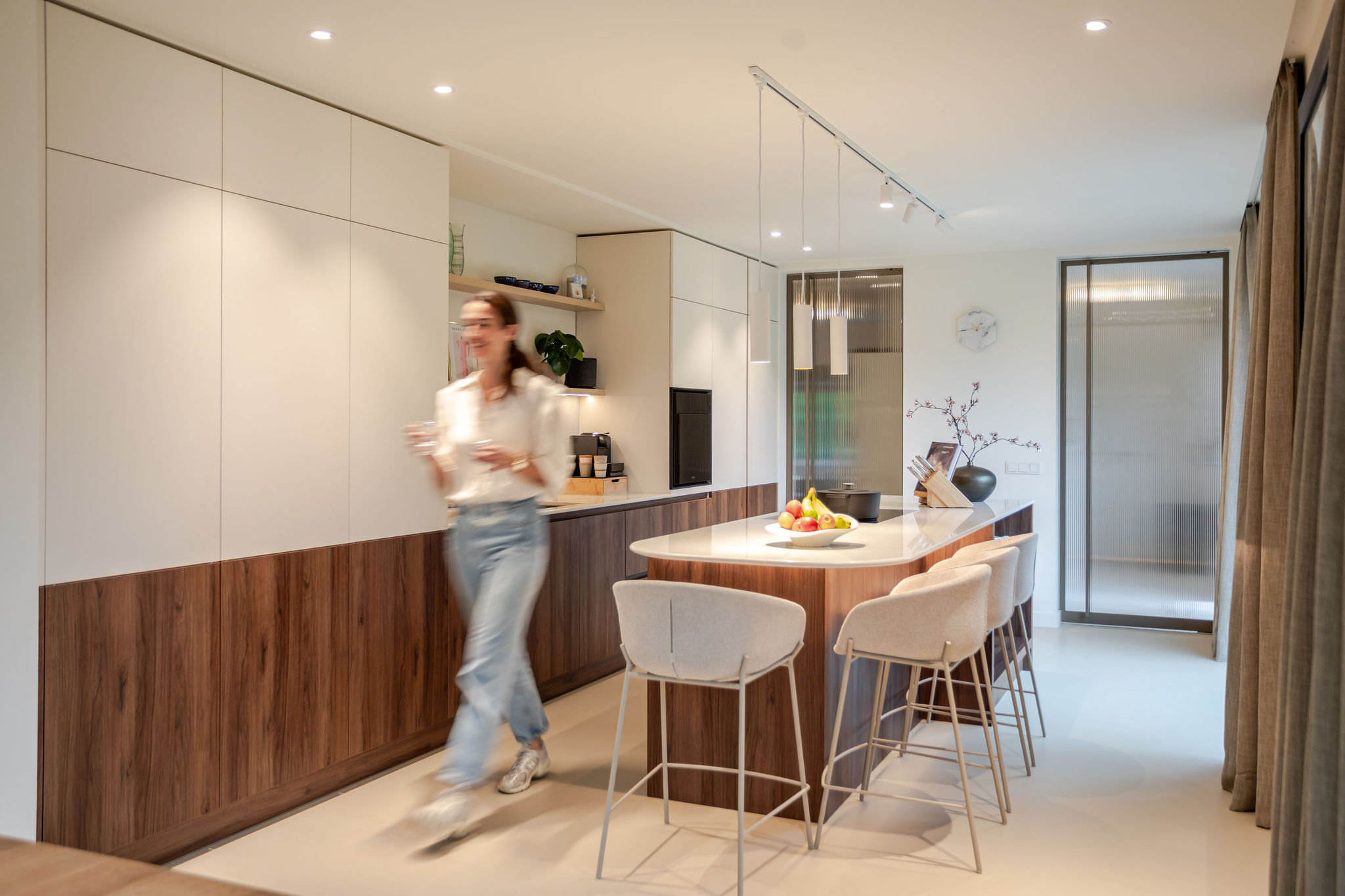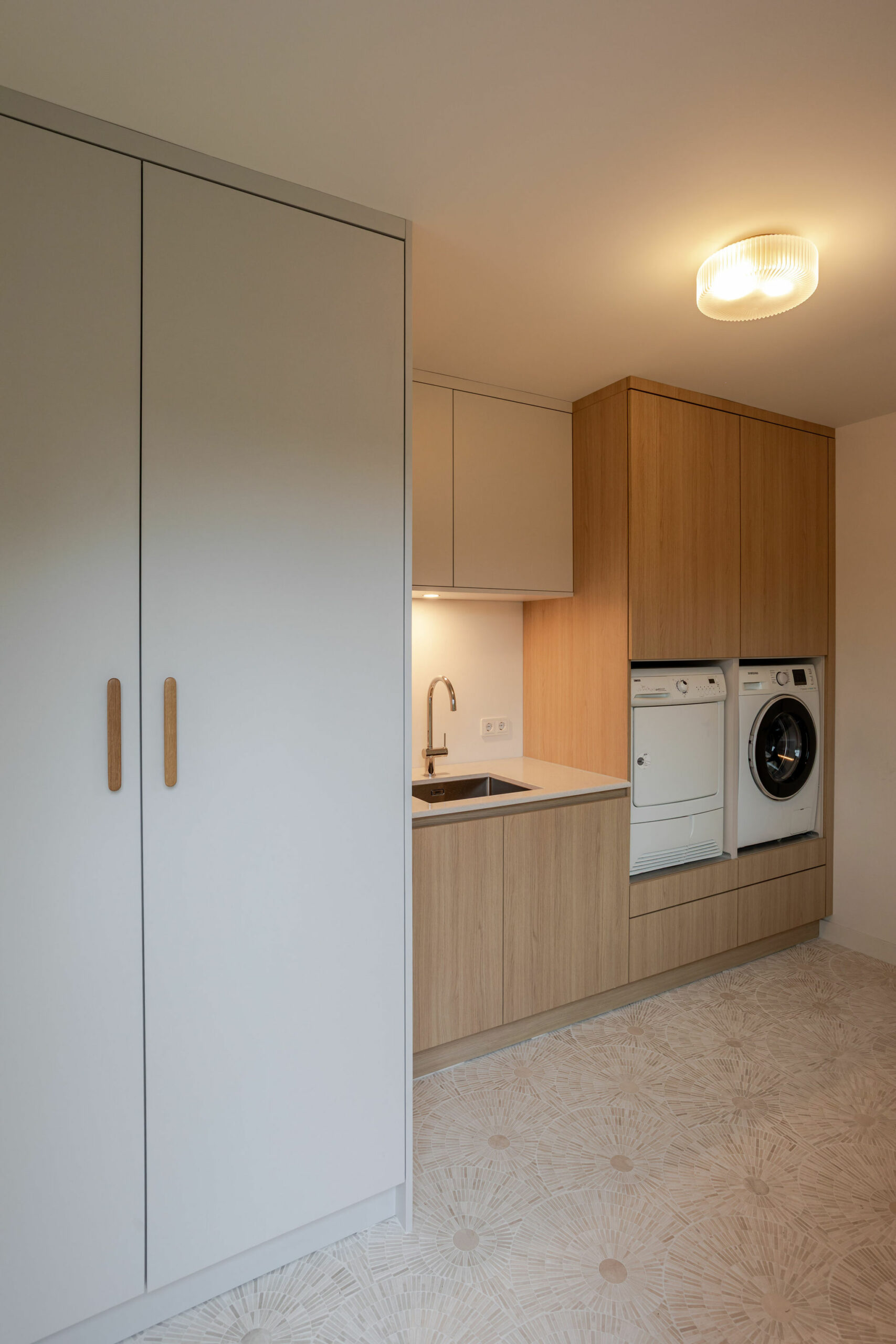 Niet alleen de keuken werd aangepakt. “We hebben ook kasten op de slaapkamers, badkamers en wc laten maken. En de bijkeuken, met dezelfde houtstructuur als de rest. Daar zijn we ook echt superblij mee.” De afwerking en stijl zijn overal doorgetrokken. Kim omschrijft die als een mix van Japandi en Scandinavisch. “Rustig, natuurlijk, en dat past perfect bij ons.”