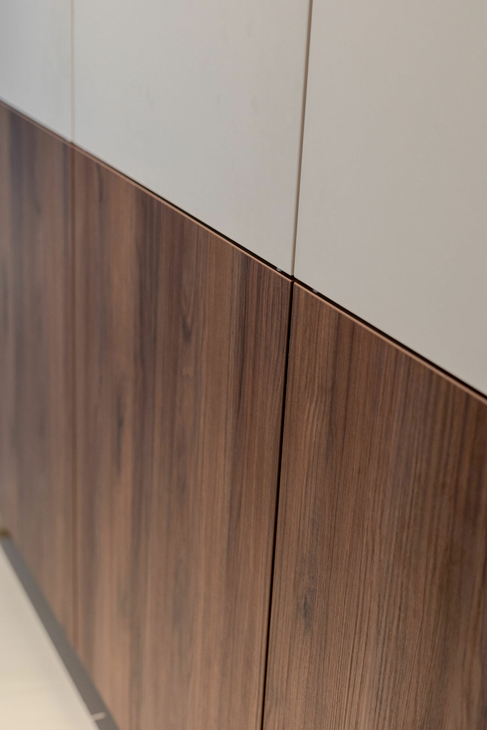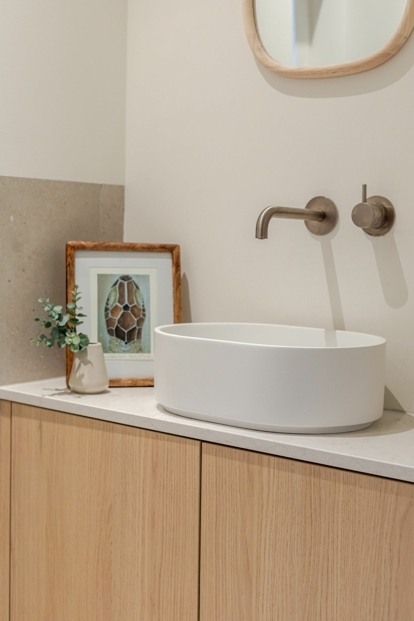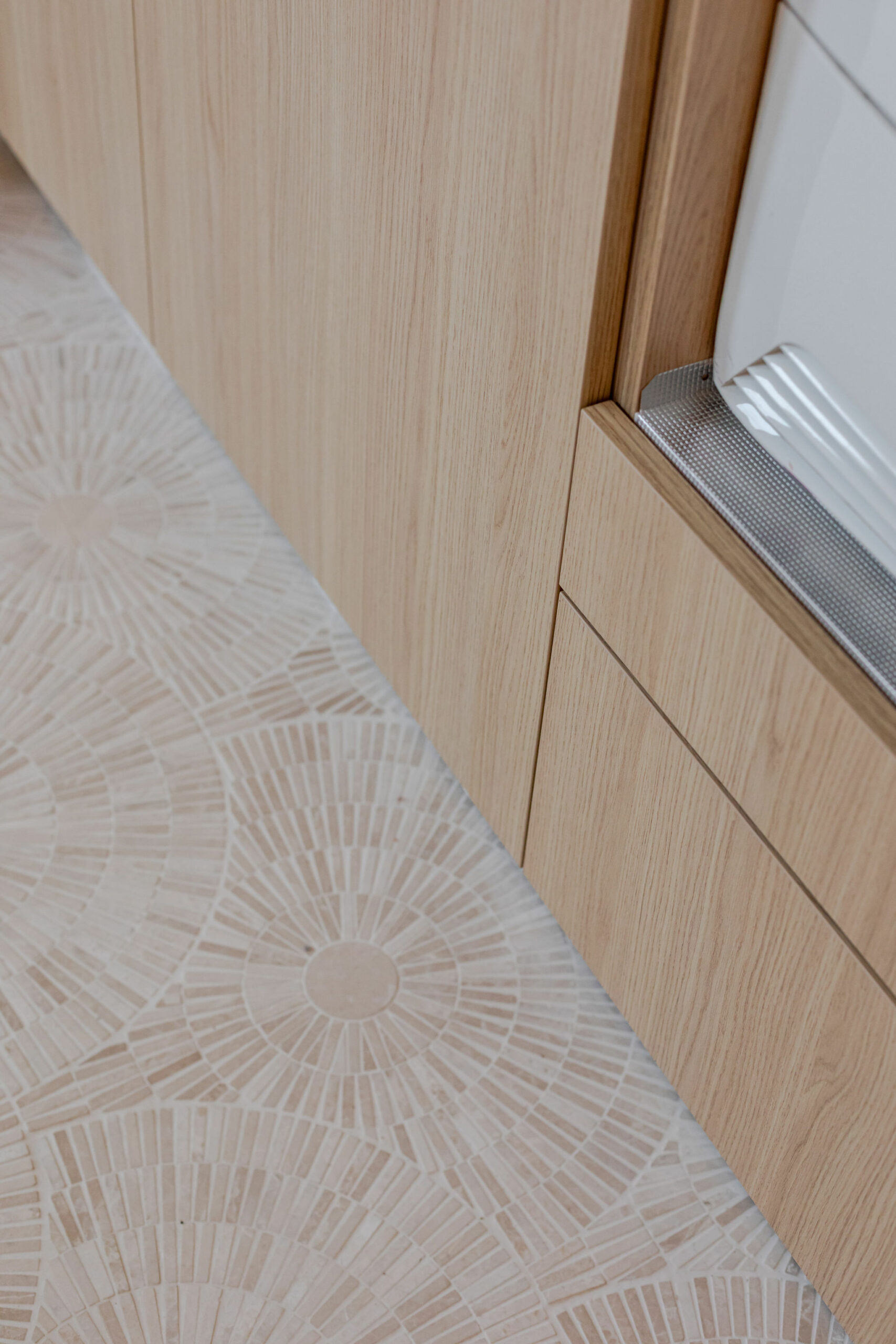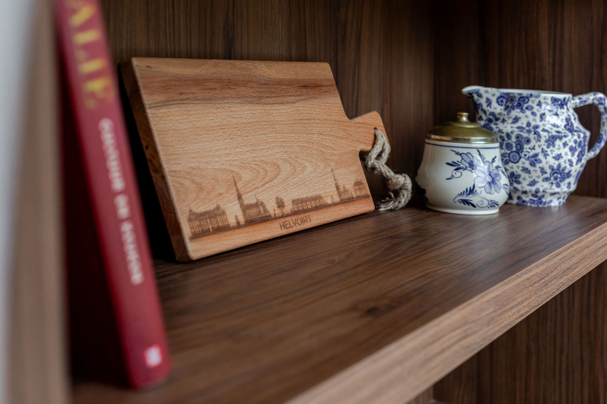 Niet alleen de keuken werd aangepakt. “We hebben ook kasten op de slaapkamers, badkamers en wc laten maken. En de bijkeuken, met dezelfde houtstructuur als de rest. Daar zijn we ook echt superblij mee.” De afwerking en stijl zijn overal doorgetrokken. Kim omschrijft die als een mix van Japandi en Scandinavisch. “Rustig, natuurlijk, en dat past perfect bij ons.”