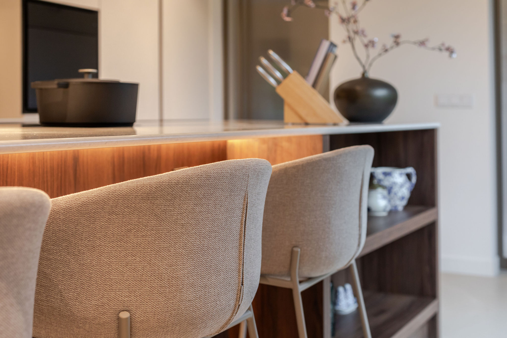 Aan de bar met overhang wordt vaak gezeten. Die keuze vroeg om een steviger blad dan ze oorspronkelijk wilden. “Het natuursteen dat we eerst op het oog hadden, was te kwetsbaar voor wat we ermee wilden. Dus we zijn op Ankie’s advies voor iets anders gegaan. Daar ben ik nu alleen maar blij mee.”