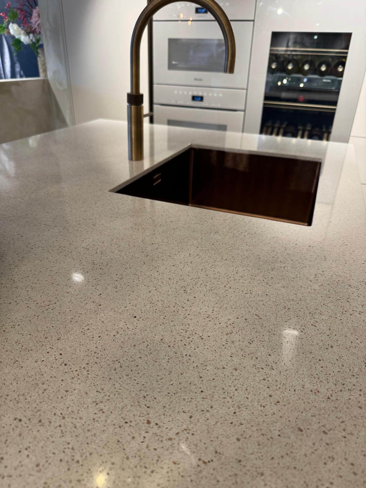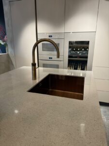 Composiet blad met fraaie onderbouwspoelbak en Quooker in messing patina