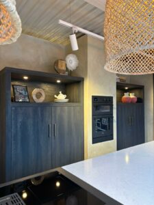De opstelling is een kastenwand van 3,44 meter breed (inclusief koof waarin de oven is ingebouwd) gecombineerd met een eiland in de afmeting 3,90 meter breed x 1,10 meter diep.